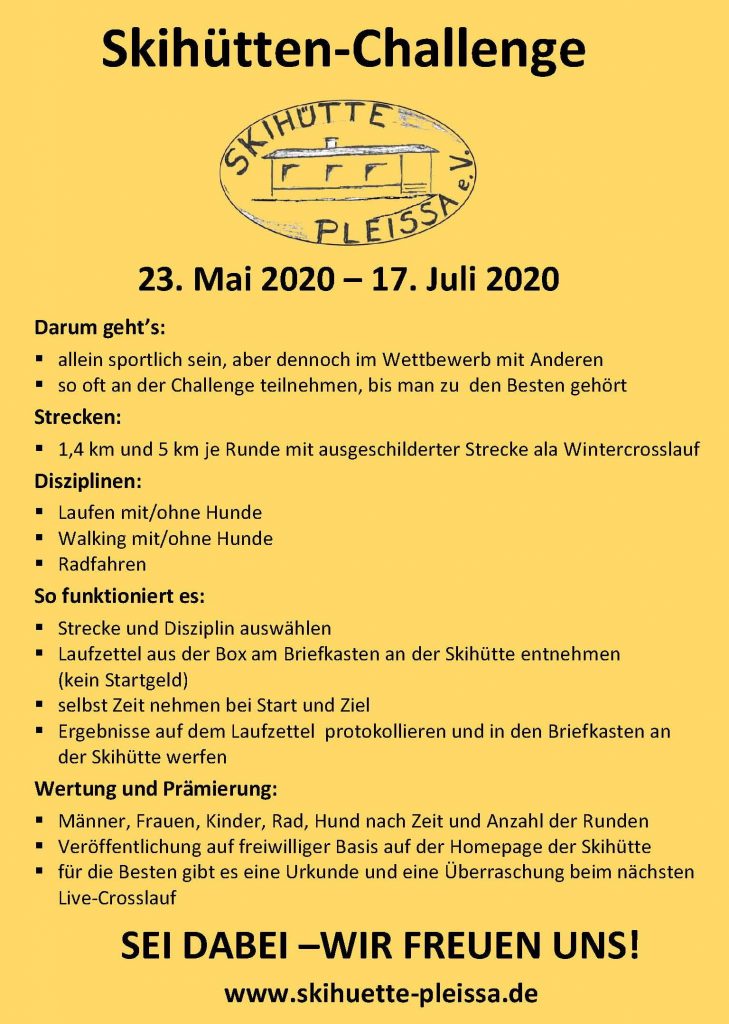 Die Corona-Pandemie hat auch vor dem Skihütten-Pleißa e.V. nicht haltgemacht. Sportliche Wettkämpfe wie z.B. ein Crosslauf können in der gegenwärtigen Situation bekanntlich nicht stattfinden. Deshalb starten wir die Skihütten-Challenge vom 23. Mai 2020 bis 17. Juli 2020.