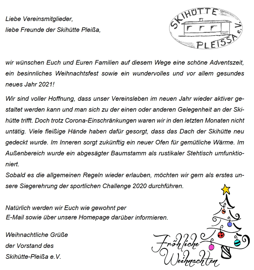 Aufgrund der Corona-Pandemie kann erst am Tag vor der Siegerehrung (17. November 2020) auf unserer Homepage nachgesehen werden, ob die Siegerehrung stattfinden kann. Weitere Fragen können per E-Mail an skihuette-pleissa@web.de gesendet werden. Zu beachten ist, dass es rund um die Skihütte keine Parkmöglichkeiten gibt. Am besten kommt man sportlich zu Fuß oder mit dem Rad bzw. nutzt die Pleißenbachstraße zum Parken. Sei dabei – Wir freuen uns.